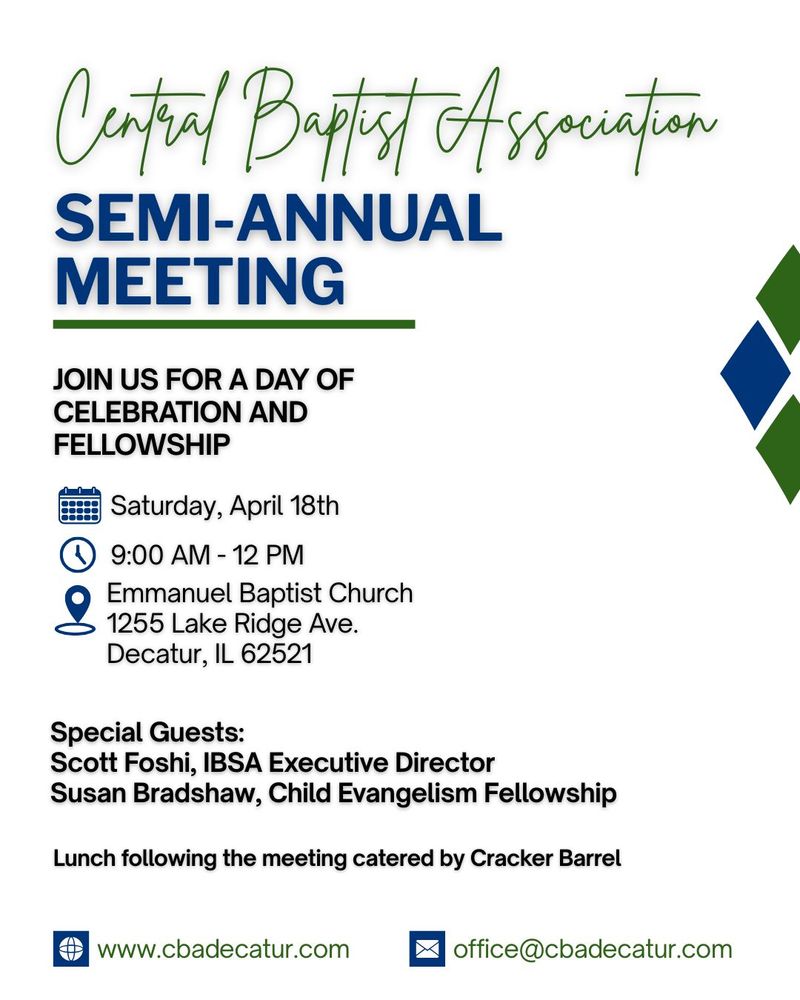 Founded in 1950, Central Baptist Association is a family of 19 Southern Baptist Churches and Missions located in Decatur, Bloomington, and most of the smaller towns located between them! You will find our Churches and Missions to be friendly, conservative, evangelical, and Baptist.